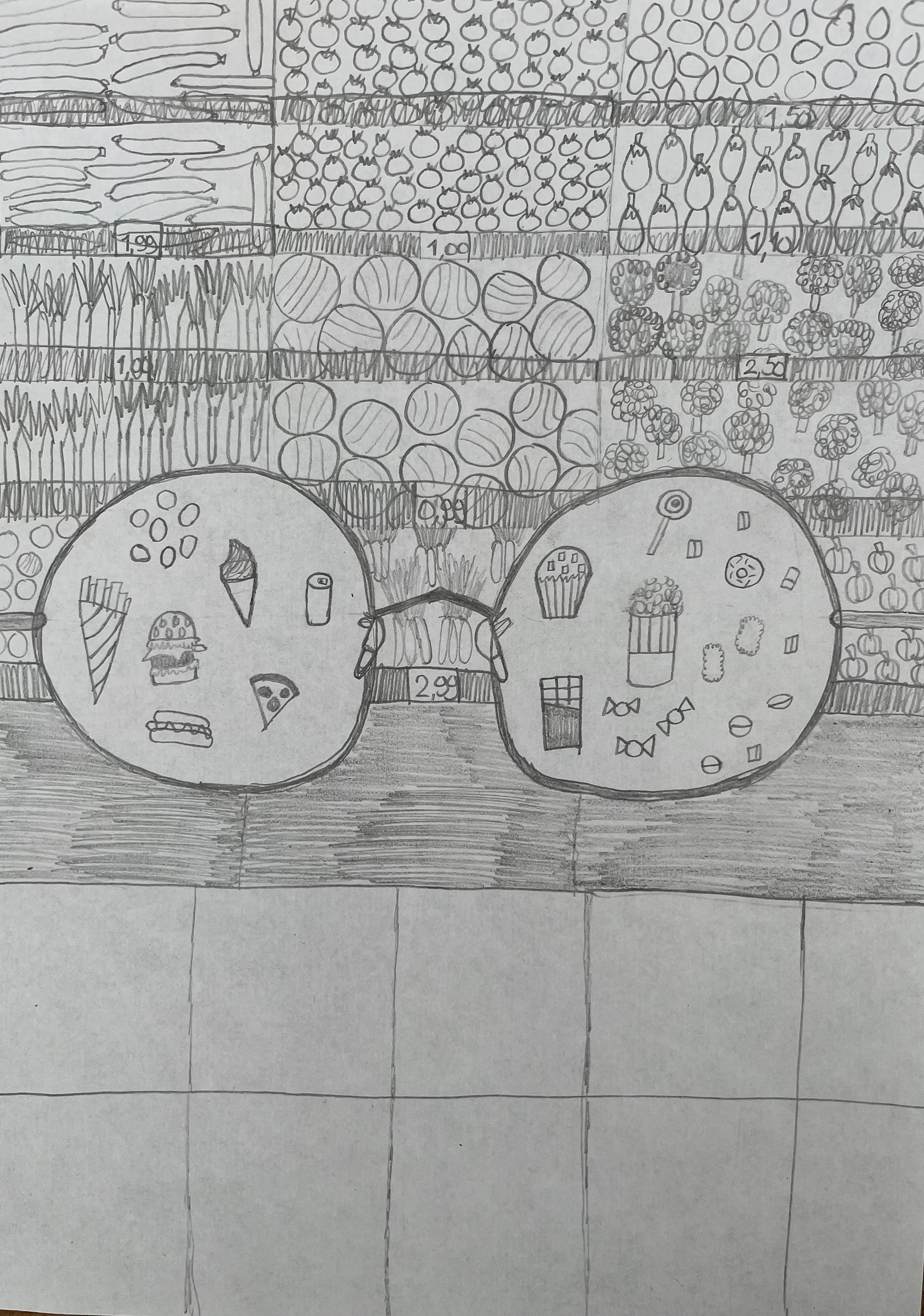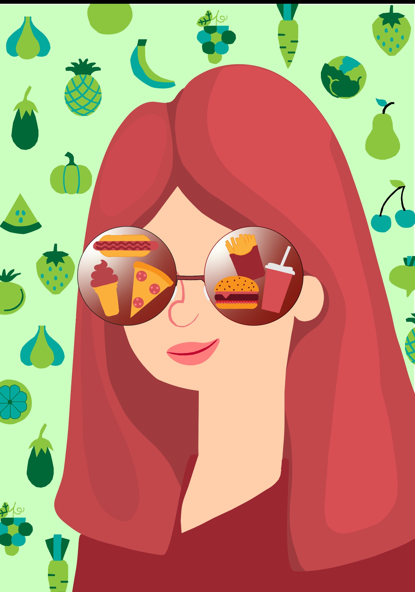 Vervolgens ben ik gaan spelen met de compositie van het beeld. En heb ik ervoor gekozen om met het laatste ontwerp verder te gaan, omdat deze het beste het contrast laat zien tussen het gezonde en het ongezonde voedsel. Dit ben ik gaan uitwerken in Illustrator tot mijn eindontwerp.
