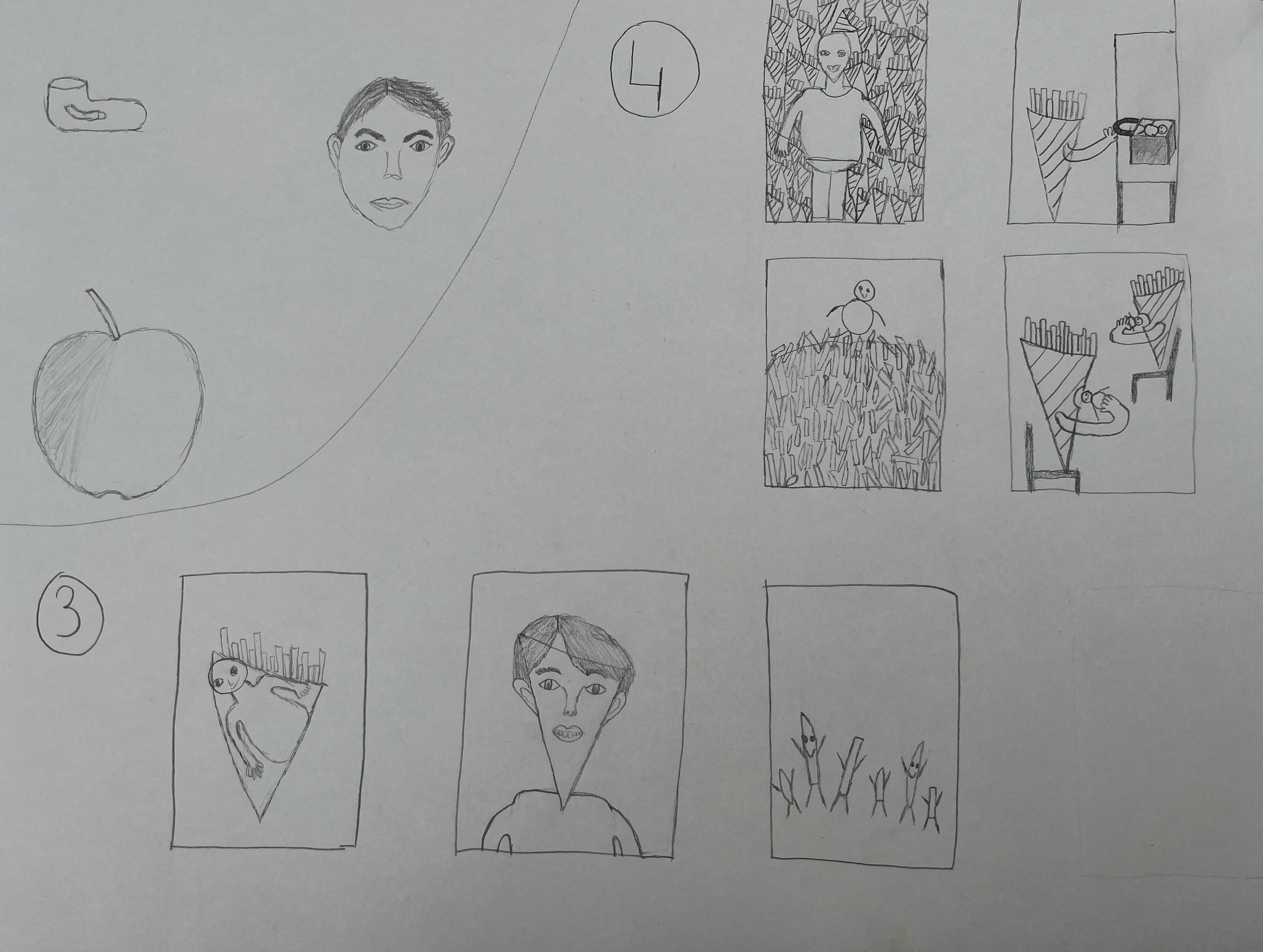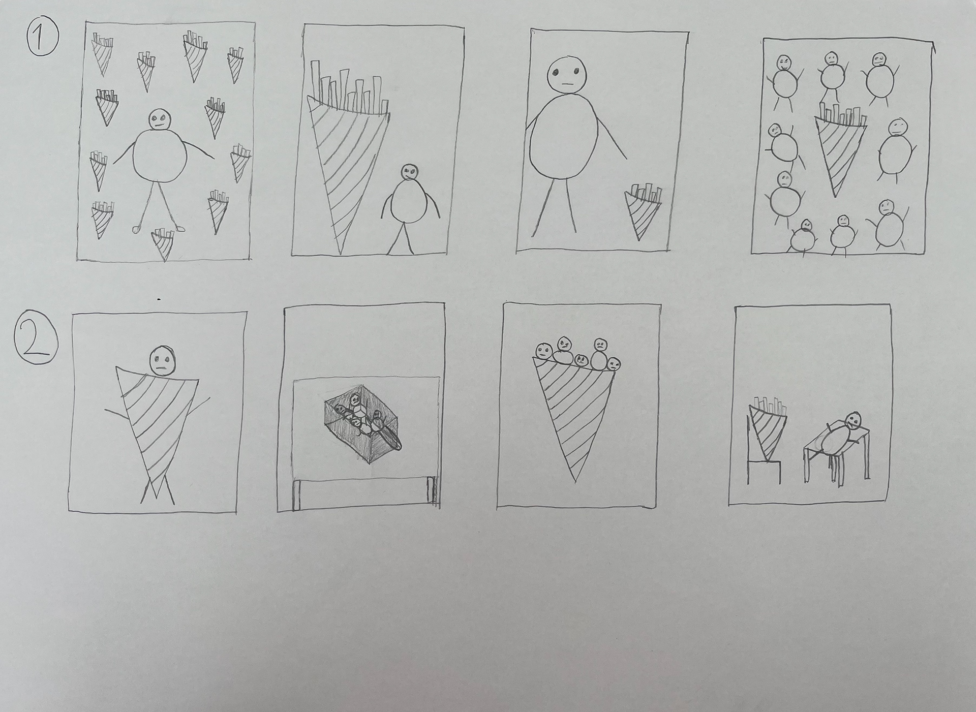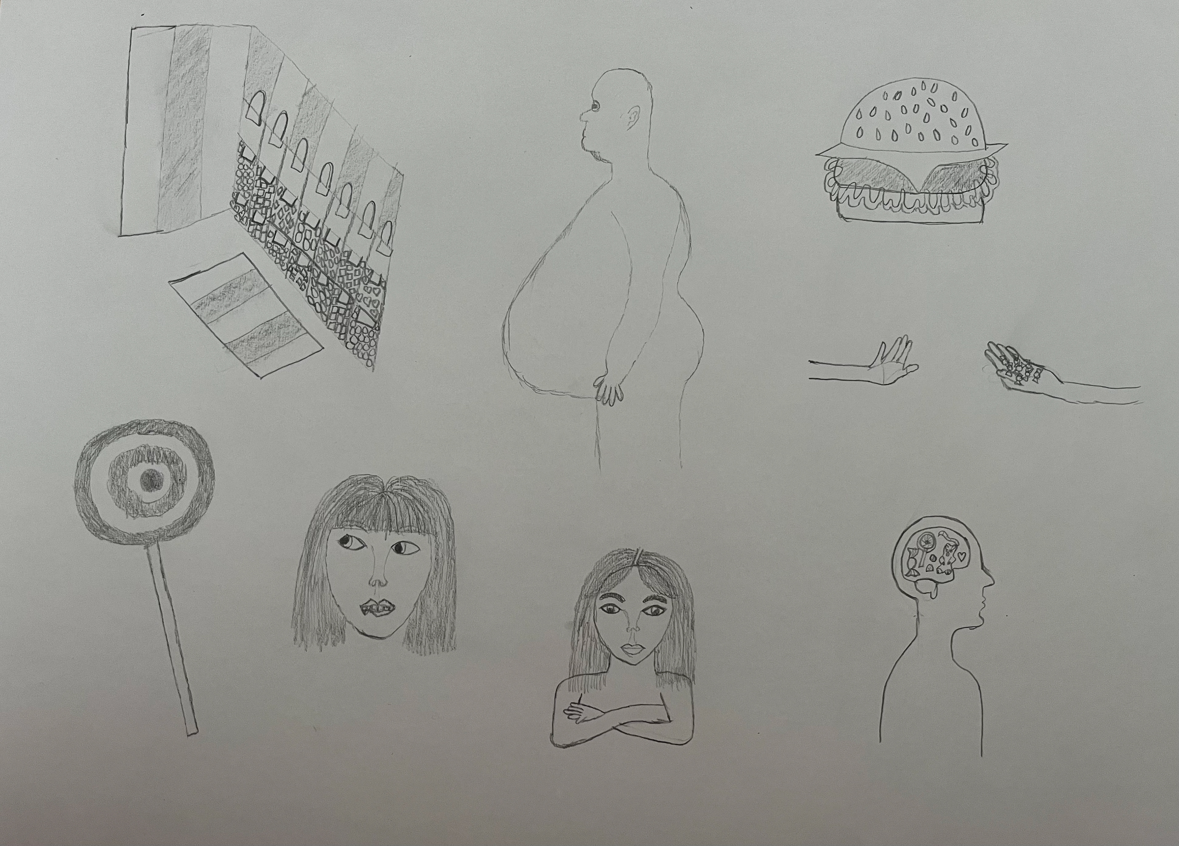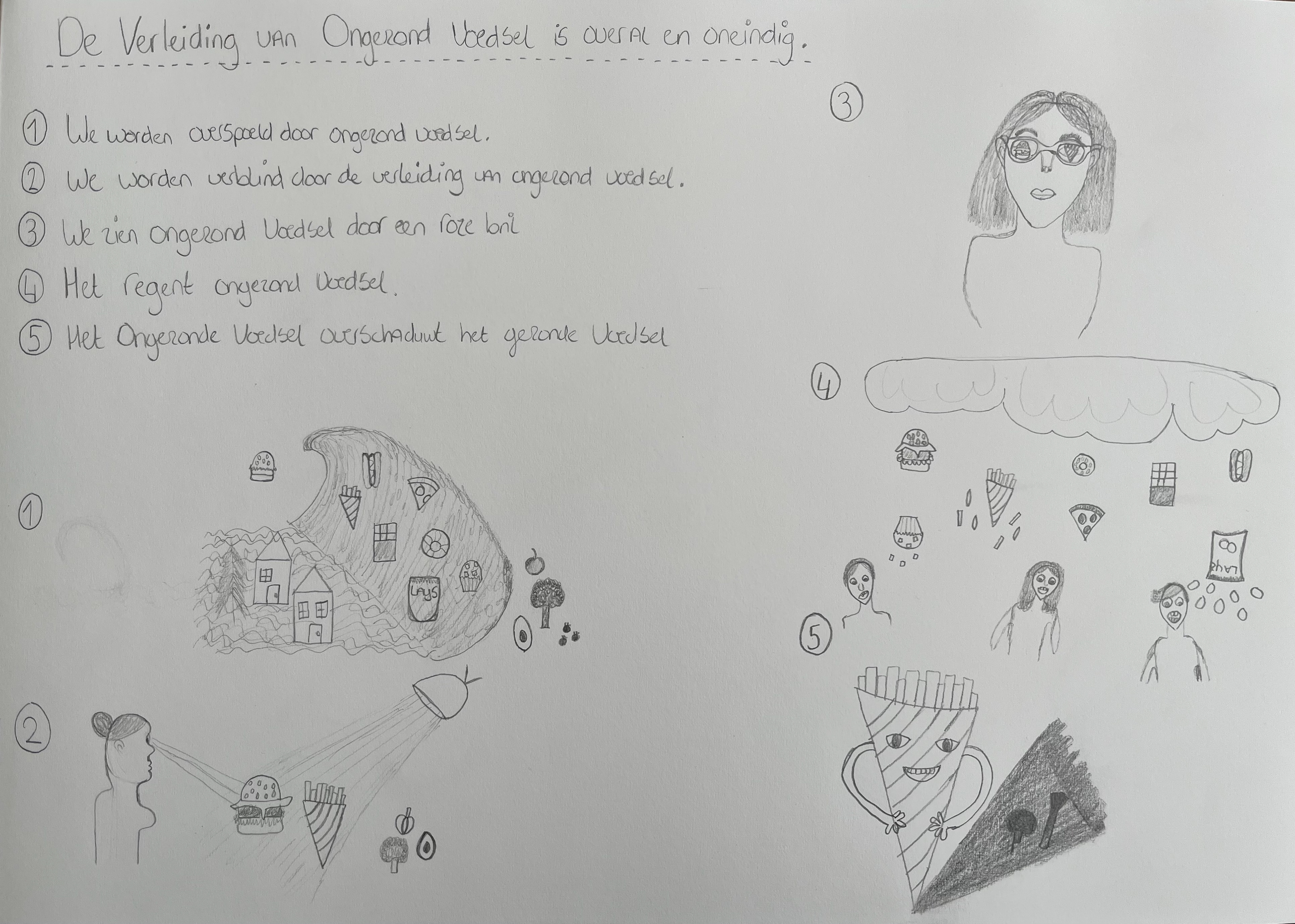 Ik ben het thema gaan verkennen door nieuwsfoto's op te zoeken die te maken hebben met ongezond voedsel. Vervolgens ben ik belangrijke elementen uit deze foto's gaan schetsen op papier. Dit heb ik gedaan om een beter beeld te krijgen van wat er allemaal te maken heeft met ongezond voedsel. Van deze verschillende elementen heb ik er twee uitgekozen om verder mee te gaan schetsen. Deze twee losse elementen ben ik gaan combineren met elkaar. Dit heb ik gedaan door ze bijvoorbeeld in elkaars context te plaatsen of door het ene element vorm te geven als het andere element. Op deze manier kom ik tot veel verschillende beelden die mij weer nieuwe inzichten en ideeën geven voor de illustratie van het eindontwerp.