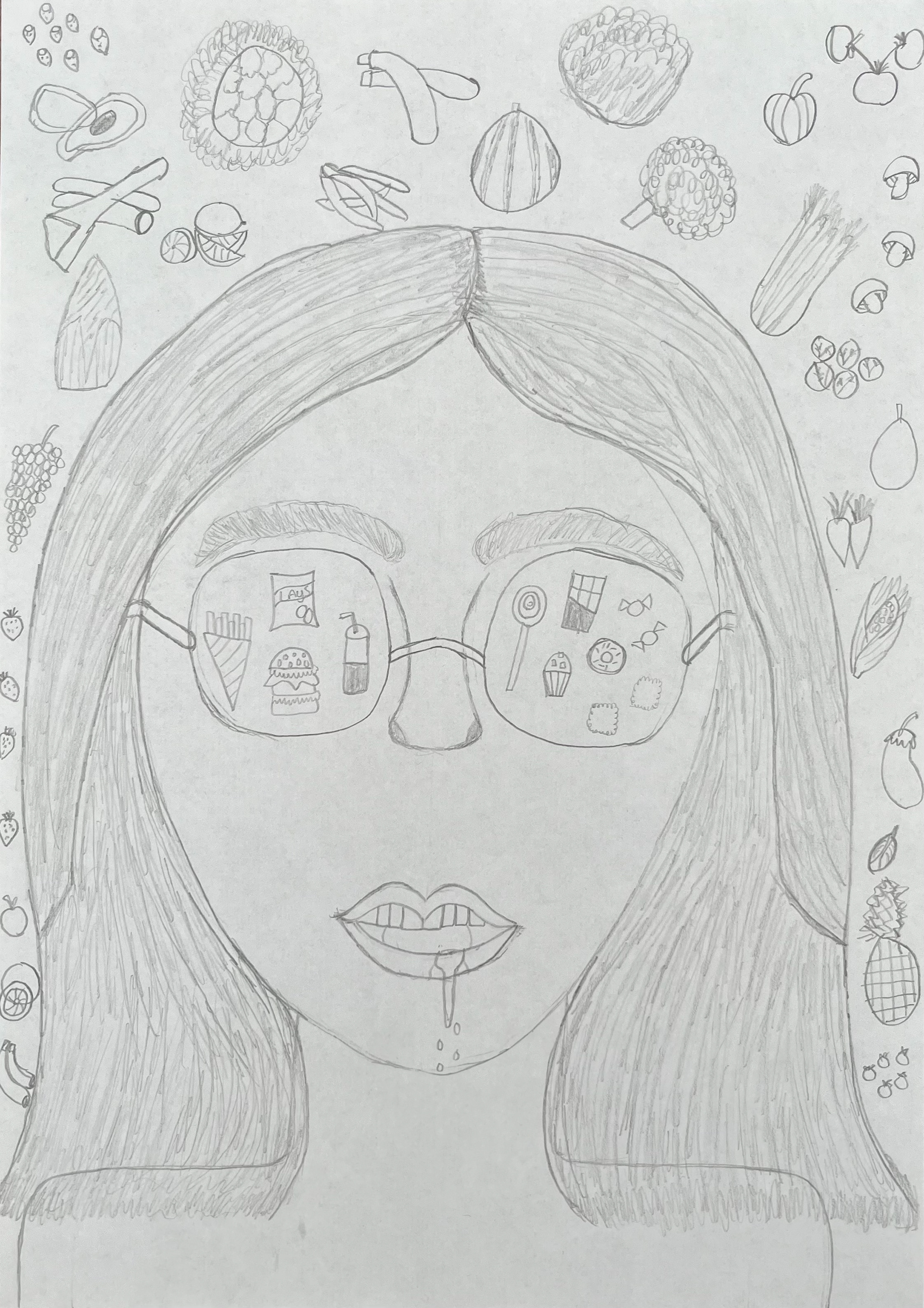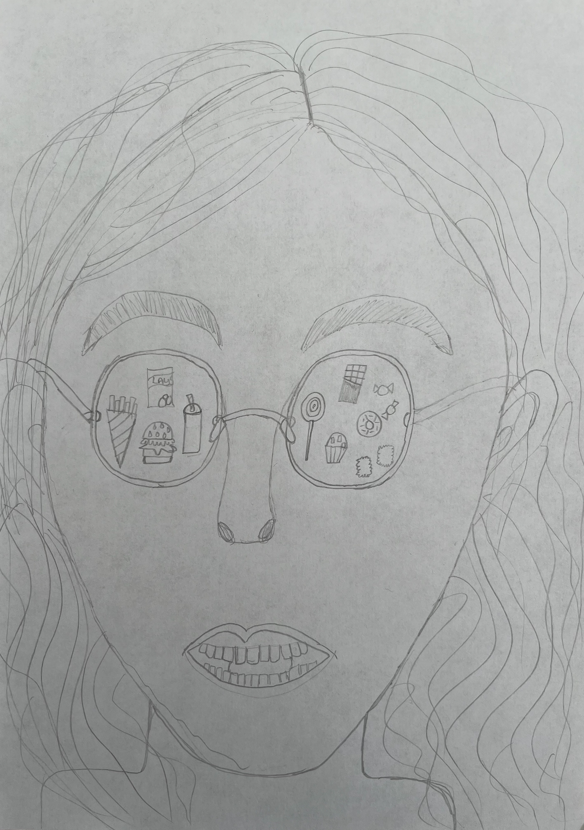 Na de verkenning van het thema ben ik mijn statement gaan aanscherpen. Ik begon met het statement: "De verleiding van ongezond voedsel is overal en oneindig." Dit statement ben ik gaan herschrijven tot een vorm waar beeldspraak/een metafoor in verwerkt zit. Hierdoor roept het statement gelijk al beelden op, wat heel erg helpt bij het vormen van een goede illustratie. Ik heb de nieuwe statements ook gelijk visueel gemaakt door er een kleine illustratie bij te zetten die in mij op komt bij dit statement. Ik ben uiteindelijk doorgegaan met het statement: "We zien ongezond voedsel door een roze bril."