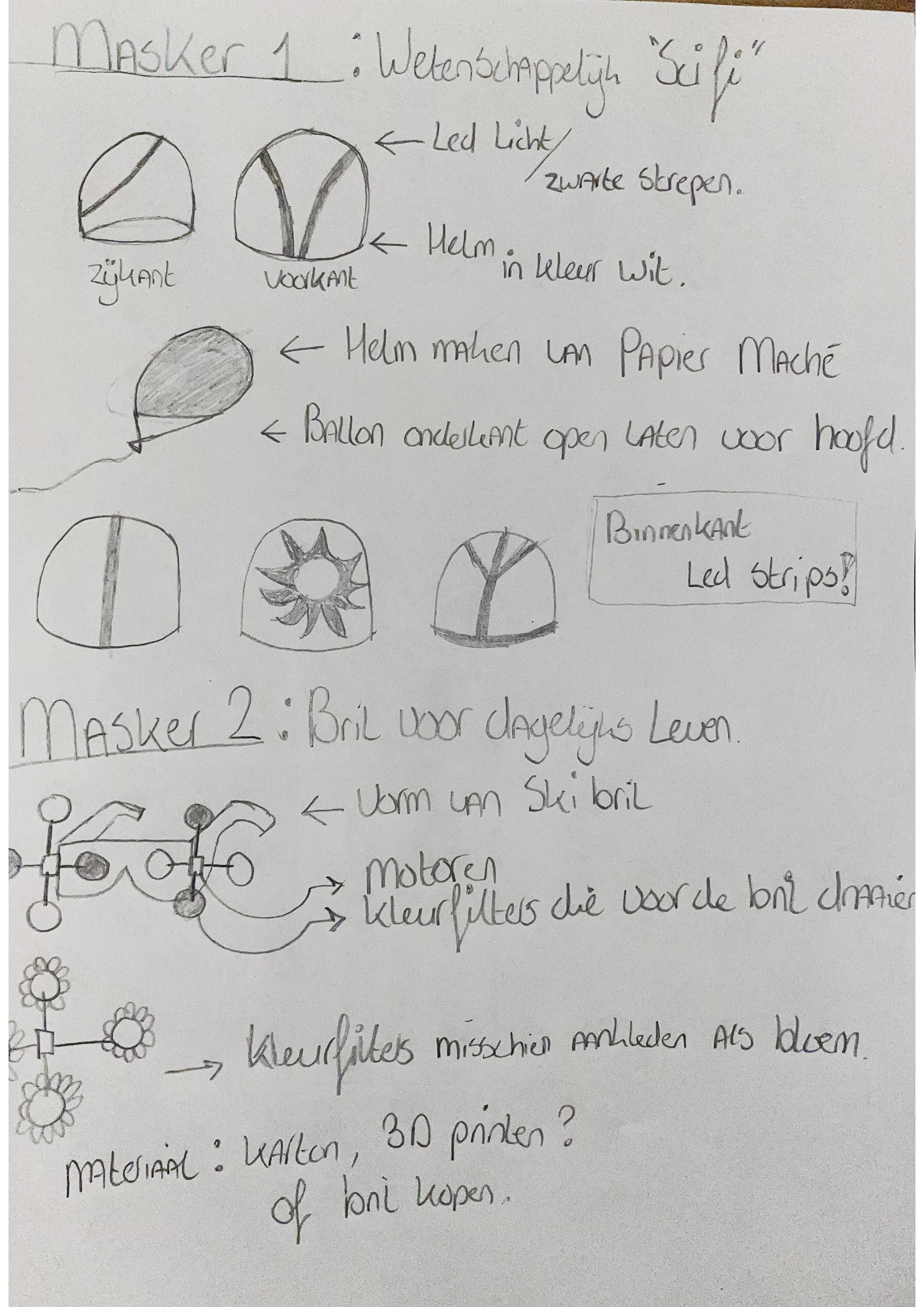 Het eindontwerp bestond uit twee maskers, namelijk het 'wetenschappelijke masker' en het 'dagelijkse masker'. Het wetenschappelijke masker moet jouw brein gaan 'herprogrammeren' door middel van geforceerde Synesthesie. In dit masker leer jij dus geuren met kleuren te associëren. Het andere masker dient als een hulpmiddel in het dagelijks leven. Dit masker is er om je te helpen herinneren wat je hebt geleerd in het wetenschappelijke masker. We kozen ervoor het wetenschappelijke masker een sci-fi look te geven, omdat het een moderne en misschien ook wel buitenaardse feeling moest geven. Het dagelijkse masker moest op een bril lijken, aangezien je dit in het dagelijks leven zou moeten kunnen dragen. Vervolgens startte het maak proces van de twee maskers.