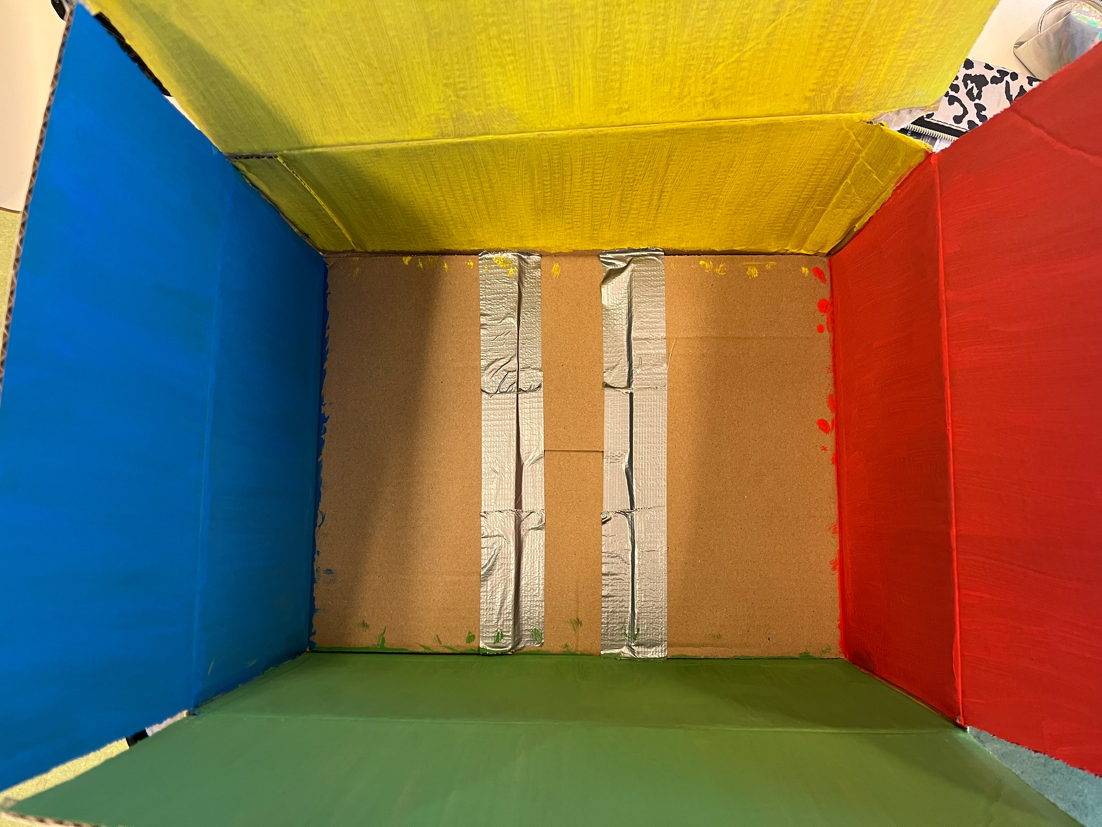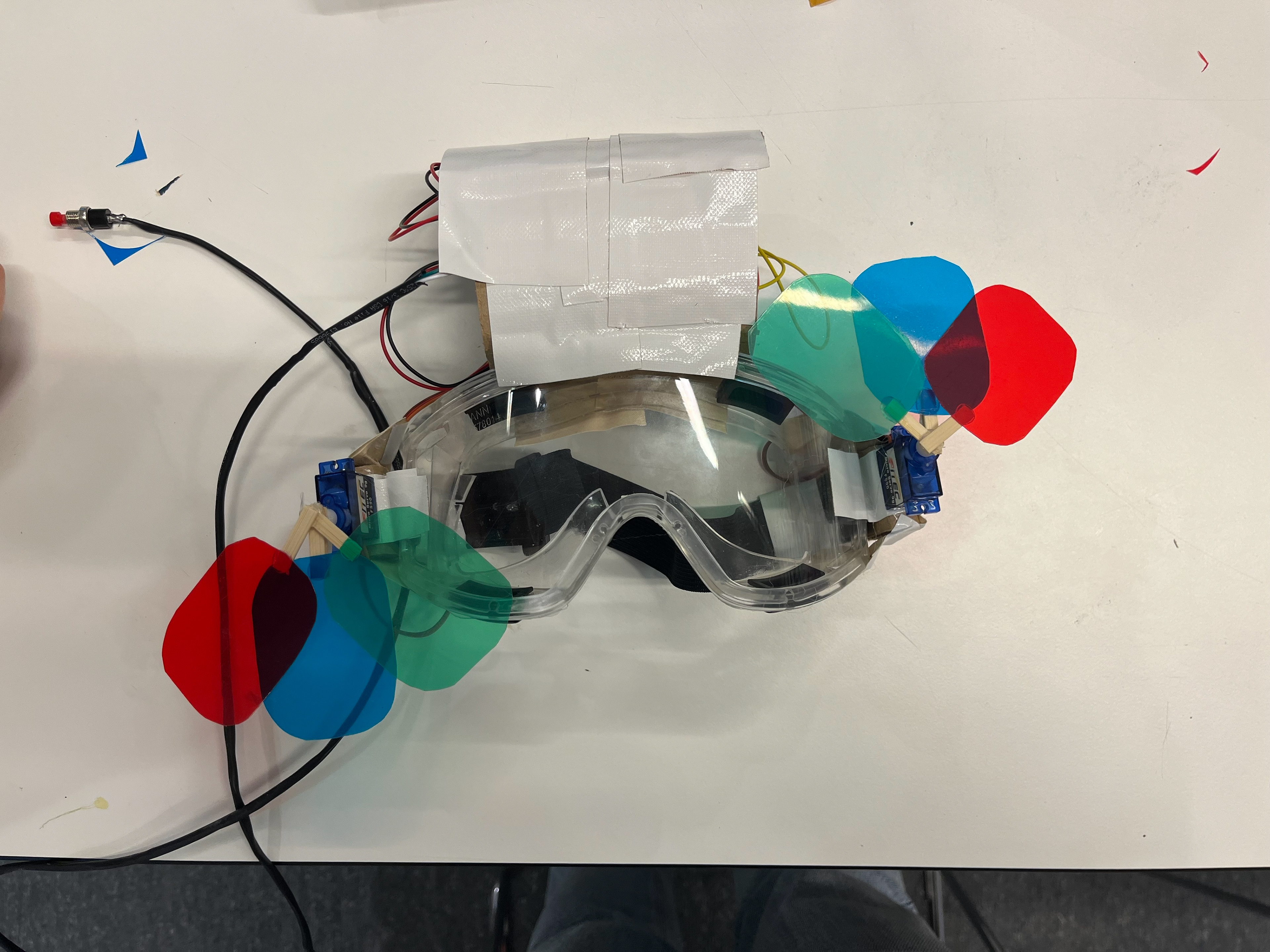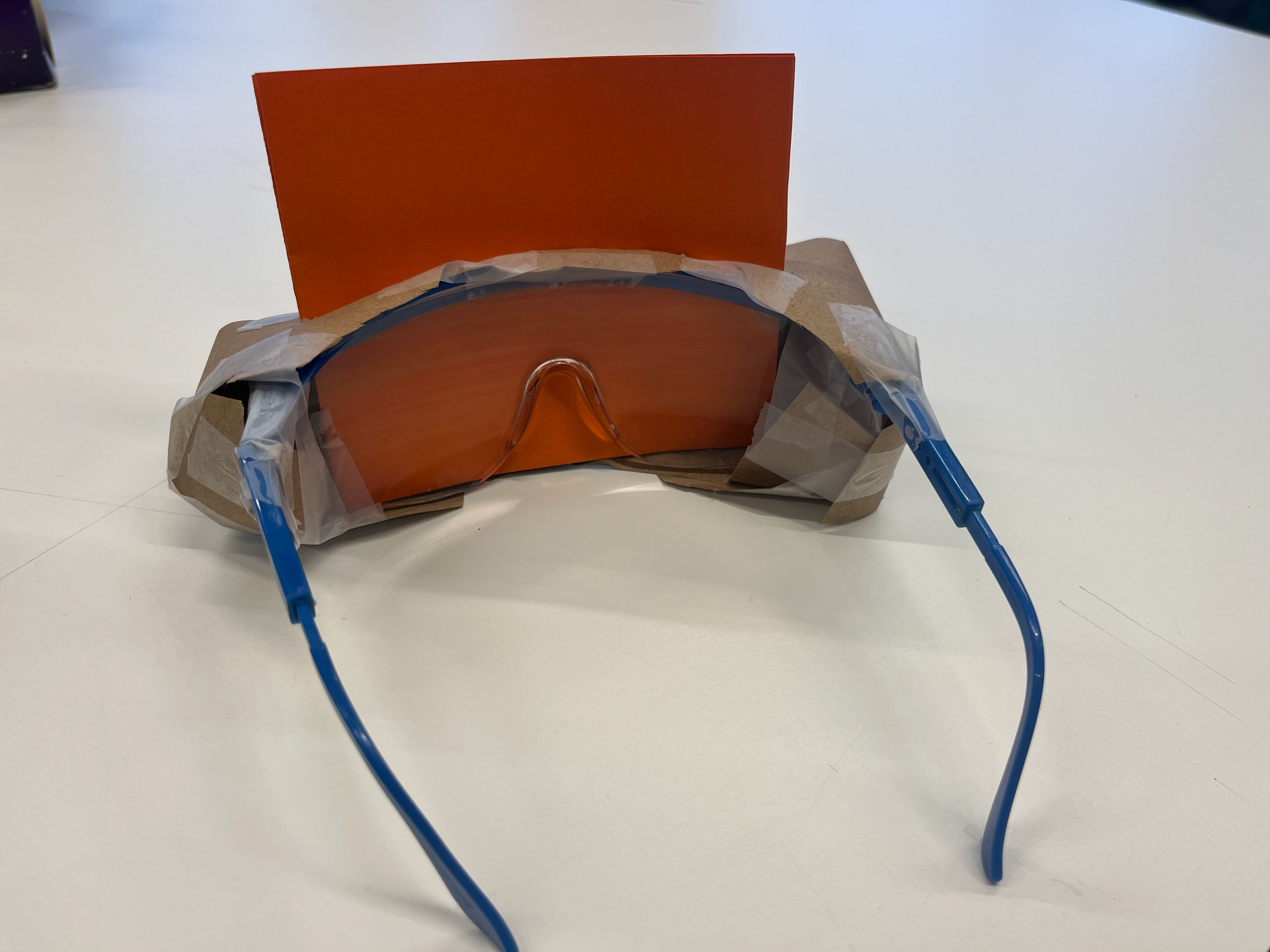 Bij de eerste experimenten wilde wij mensen die geen Synesthesie hebben dit wel laten ervaren. We kozen ervoor om mensen bij een geur een kleur te laten associëren. Dit hebben wij op twee verschillende manieren uitgeprobeerd namelijk met een bril en een doos. De bril was helemaal bedekt waardoor de drager niks zag en op het moment dat er een geur werd waargenomen door de drager werd er een kleurfilter in de bril geschoven. Hierdoor werd de drager dus 'geforceerd' om bij die geur een kleur te zien. De doos hadden we aan de binnenkant in vier kleuren geverfd. De doos werd over het hoofd van de gebruiker gezet en op het moment dat de gebruiker een geur rook, moest hij de doos draaien naar de kleur die hij hierbij associeerde.